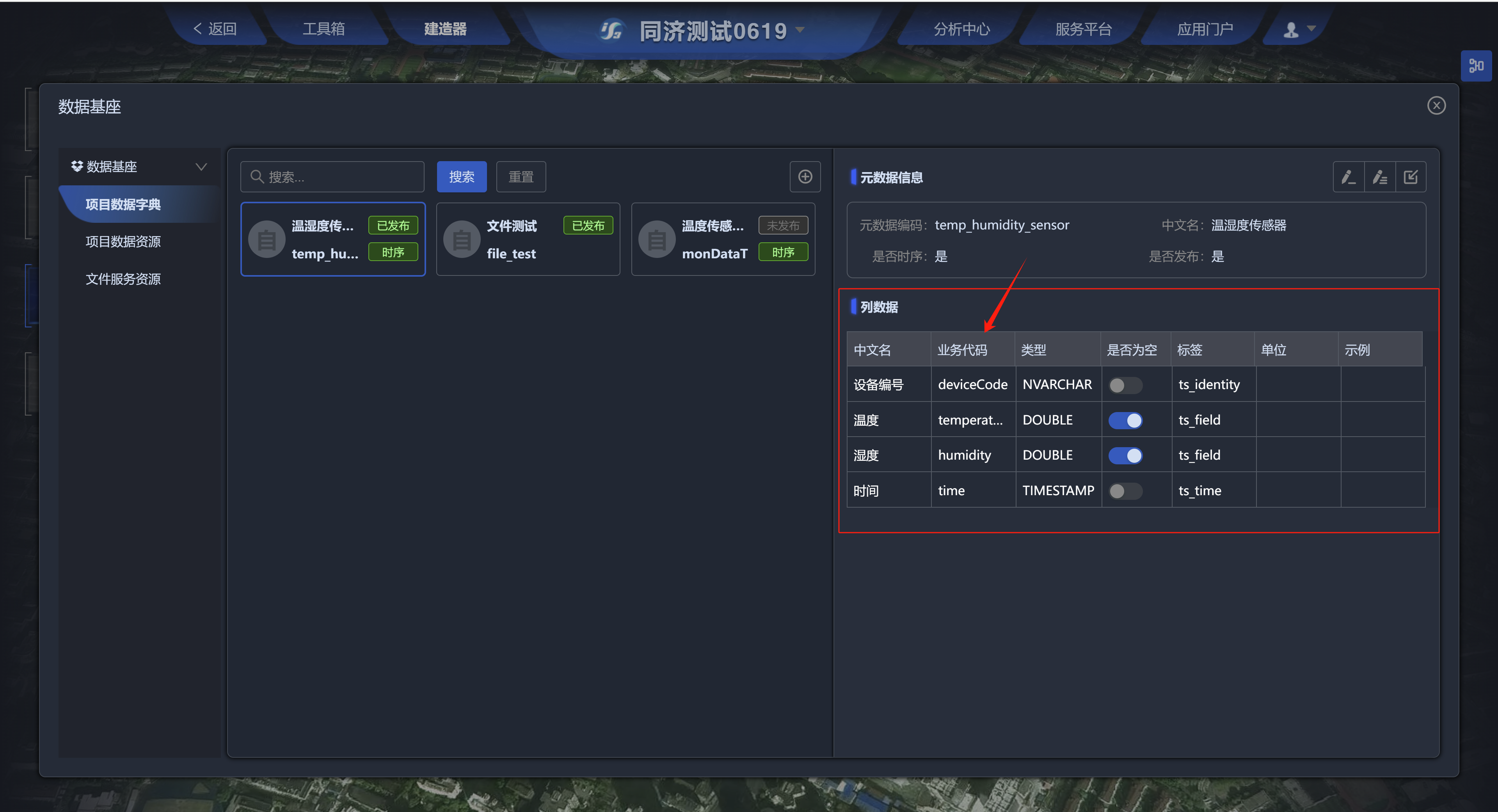 [ { "deviceCode": "sensor_bj", "time": "2024-06-23 15:54:38", "temperature": "27.1", "humidity": "86%" }, { "deviceCode": "sensor_bj", "time": "2024-06-23 15:55:38", "temperature": "28.1", "humidity": "86%" } ]数据上传成功后在数据基座中查看