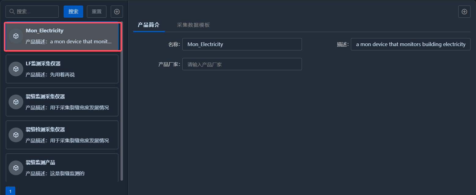 按照物联基座文档创建实时建筑电量的产品模板,如下图所示: