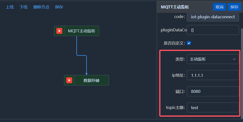 按照物联基座文档创建MQTT插件与数据存储插件串联的任务流,其中节点配置样例如下