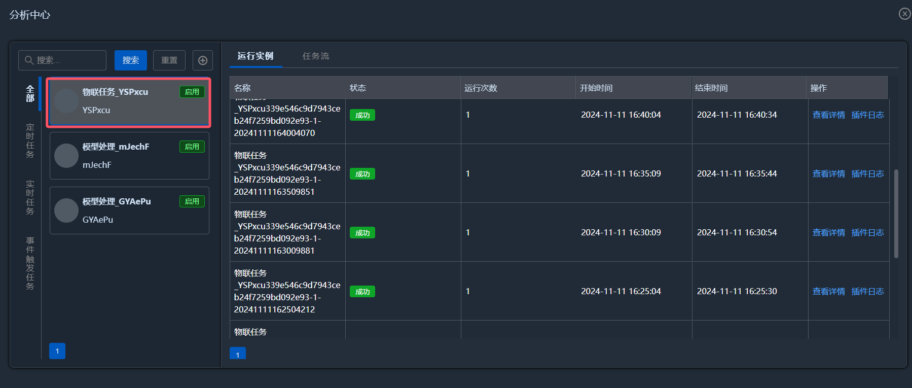 点击存储并运行,系统会根据传感器上传数据的时间间隔(如5min)定时构建任务,可以在分析中心查看