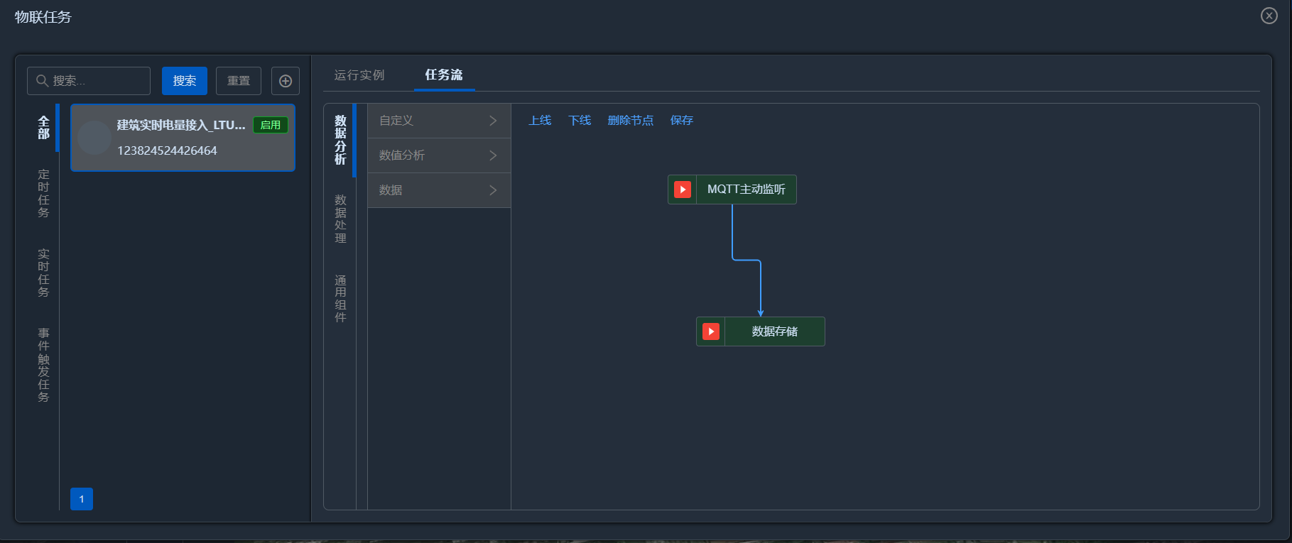 接着通过构建任务流,接入实时电量传感器,并存储其上传的数据。